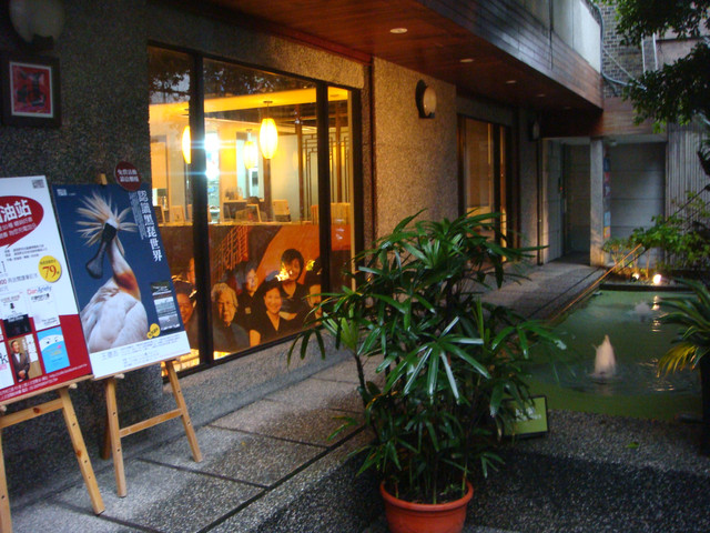 簡單大方的玻璃門分隔了室內、外, 門旁有個擺放藝文資訊的小書櫃