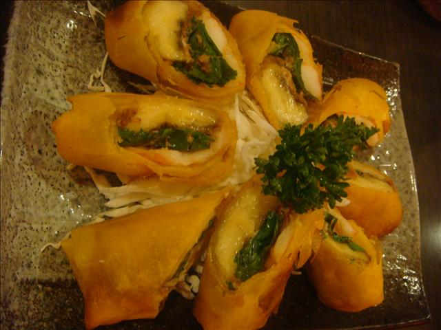 結果, 原來是用類似蛋皮的麵皮包裹著香蕉、蝦沙拉和香菜, 炸的酥脆金黃的"捲"類食物