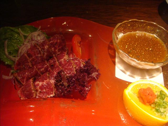肉質鮮嫩細緻、油花分布均勻的薄切生牛肉片, 外緣用噴槍略為燻烤過, 有著外熟內生的絕妙口感