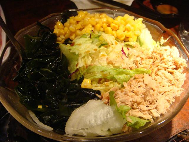 樂樂的綜合沙拉很豐富, 有萵苣、海帶芽、玉米和鮪魚