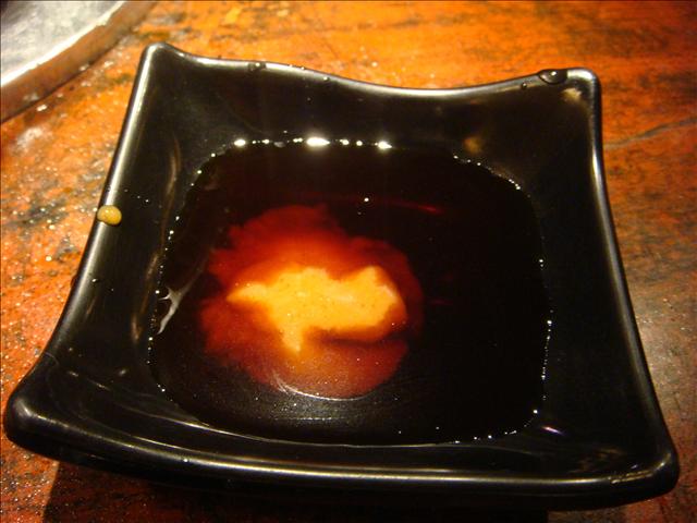 一開始, 我們就依個人喜好隨意調配自己的沾醬, 有了醬油兼烤肉醬、辣味噌、像關東煮沾醬的不知名沾醬等