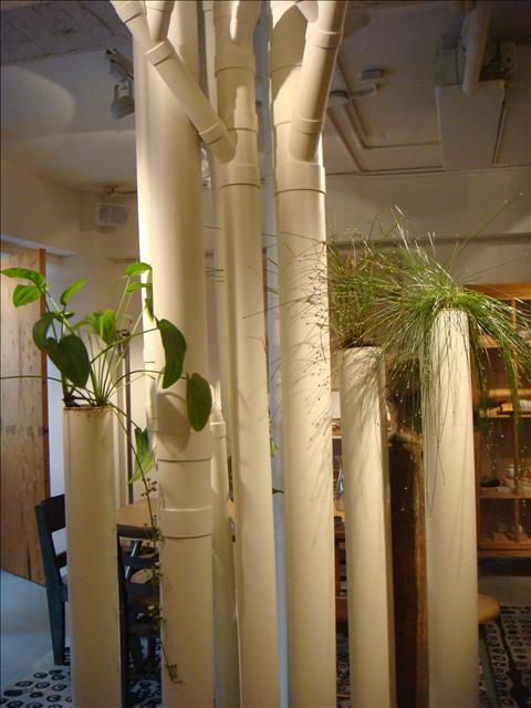 eg. 在裸露的白色水管裡栽種植物、壁掛式鹿角原木抽屜