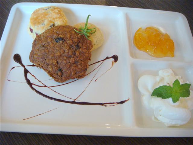 基本上, 甜點盤的組成物每天不盡相同, 我們當天吃到的是燕麥餅乾、迷迭香餅乾和scone