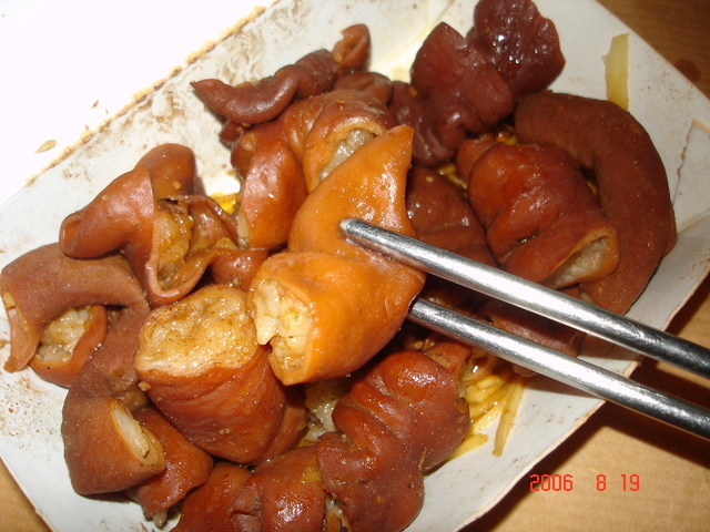 1.紅燒大腸 2. 沙拉魚卵 3.芥茉軟絲 4.紅燒肉 5. 高家粉肝