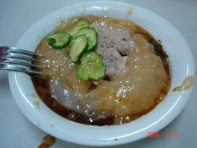 半透明的皮、軟嫩的肉餡,配上醃小黃瓜片,加上甜甜辣辣的醬