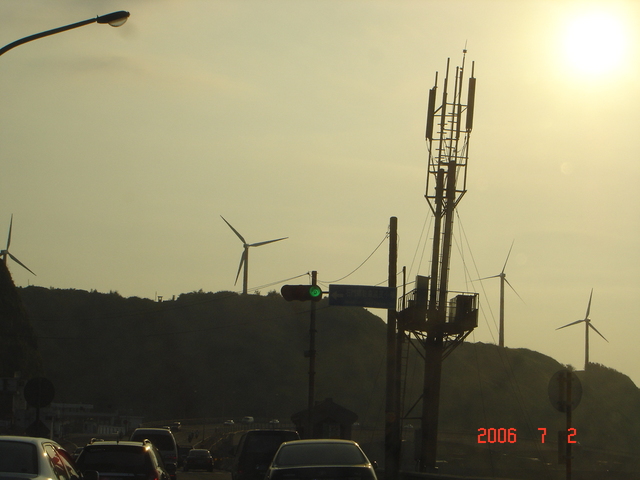 快到石門時,前方的山頭上,矗立著幾支大風車