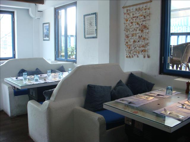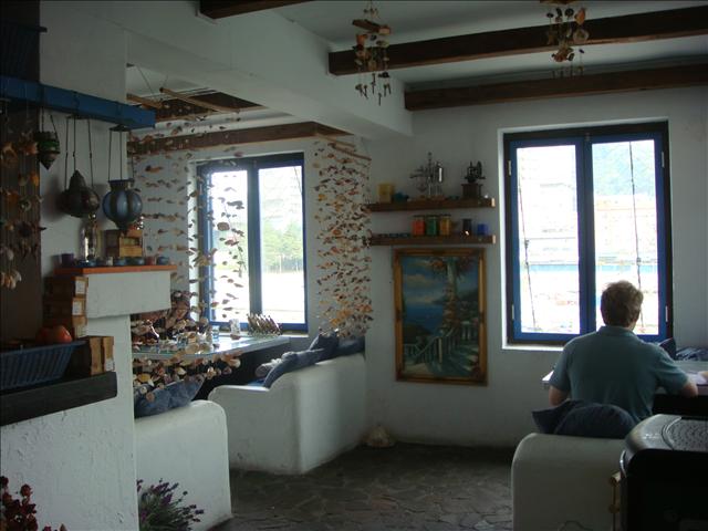 藍色窗框、白色牆壁與水泥座椅、貝殼裝飾....