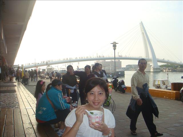 選好店家, Helen 和我就隨意坐在小吃店前, 以情人橋當背景, 吸哩呼嚕地享用熱騰騰的湯點