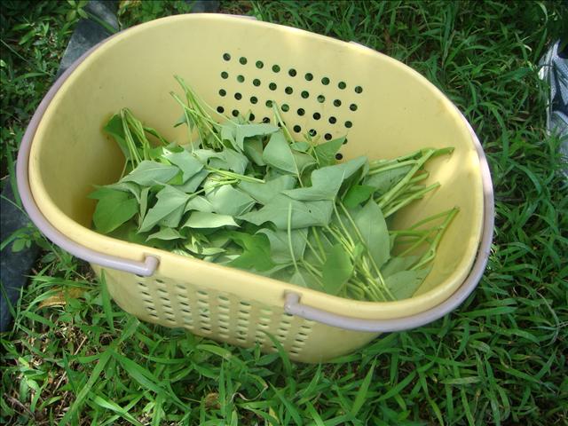 還好採地瓜葉並不難, 只要記得摘上端嫩葉的部分就好