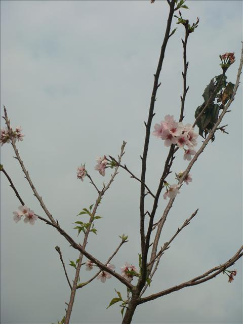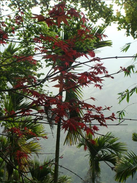 仍有看到一兩株仍有些許櫻花綻放的櫻花樹和葉子依舊火紅的楓樹