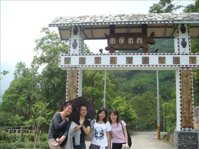 牌樓中間的木頭匾額,向外寫著「望鄉部落」,向內是「米厚米尚」