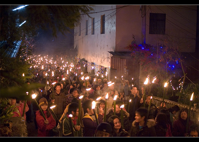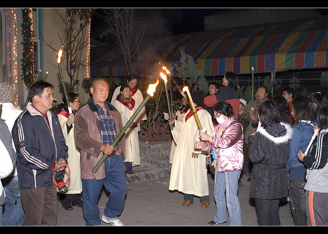 在家等候的居民, 則在牧師和長老敲門後, 點燃火把加入隊伍行列, 繼續前進下一家