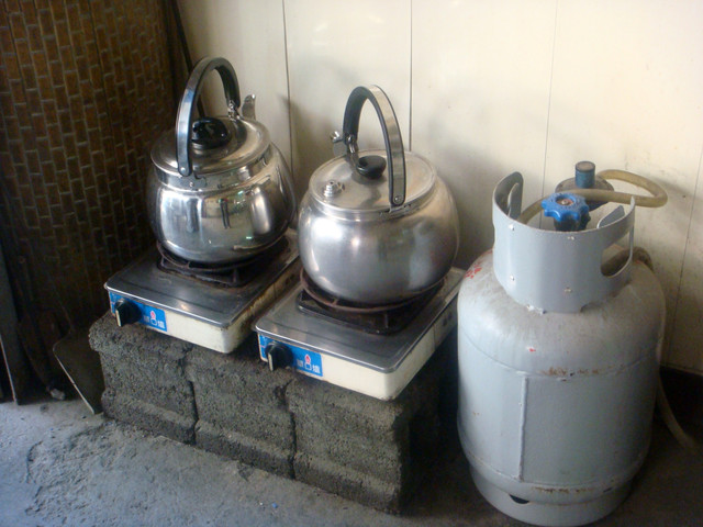 擺在牆角瓦斯爐上加熱的兩個大茶壺, 待會就會派上用場啦