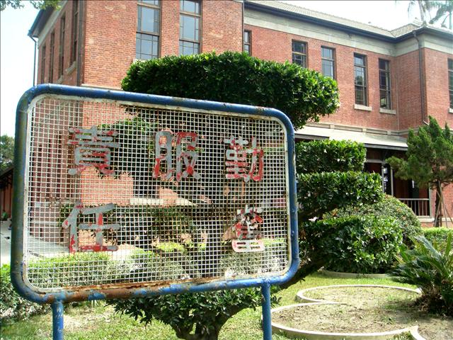 紅樓前面的小庭院還保留著過往的標語牌「勤奮 服從 責任」