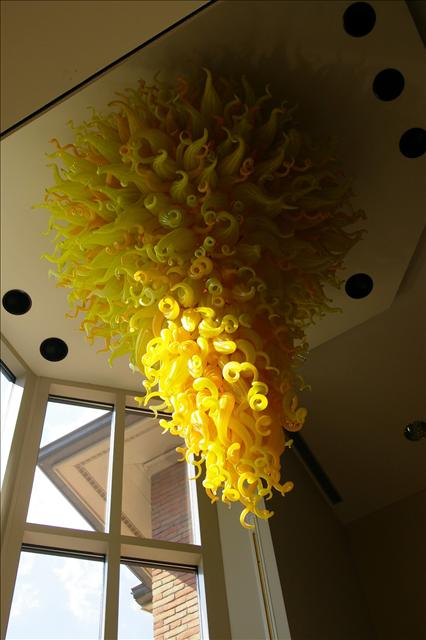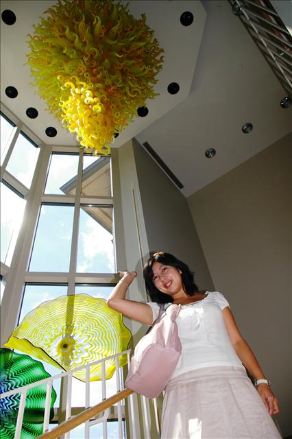 通往2F的階梯上方, 則懸掛著美國現代玻璃藝術家Dale Chihuly特別為這裡創作的大型變形玉米燈飾