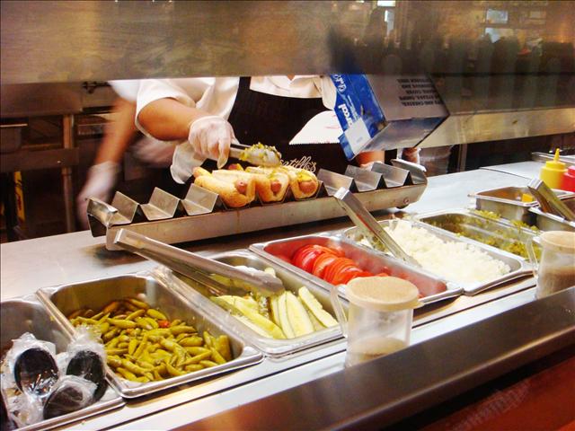 採自助取餐, 先去排隊點好餐後, 就可以去取餐區邊參觀hot dog 製作檯邊等待嚕