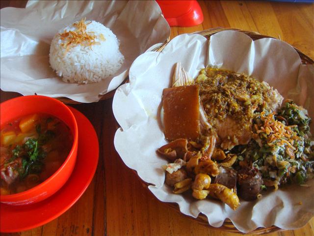 "Nasi + Babi Guling Pisah 綜合烤乳豬飯" (Rp. 40,000 / US$4.4) 裡什麼都有