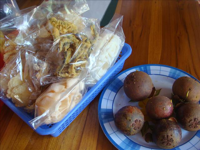 如果想吃點小零嘴或來點新鮮的水果, 桌上那一包一包包裝好的蝦餅、炸豬油或新鮮山竹等皆可自行取用