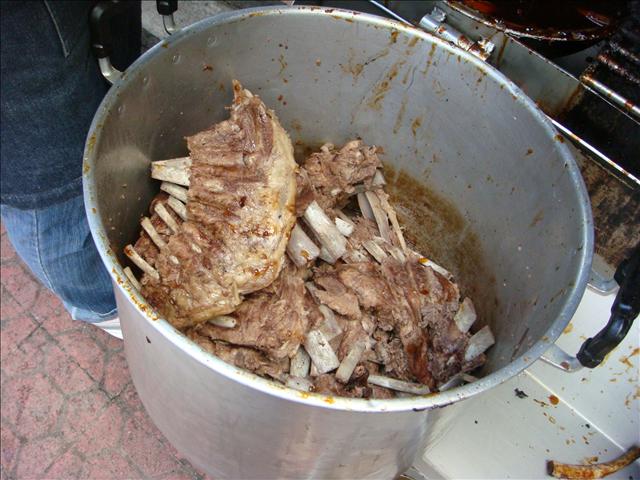 有豬肉、脆皮、血腸、豬內臟、炸豬油等, 還有蒸過的蔬菜雜燴