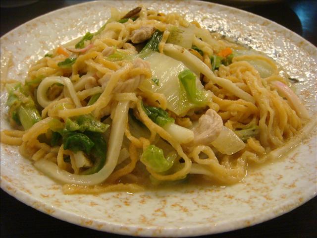 是用炸過的意麵 (同鍋燒意麵) 加上肉絲、青菜等食材下去炒的