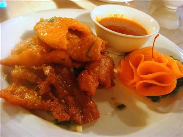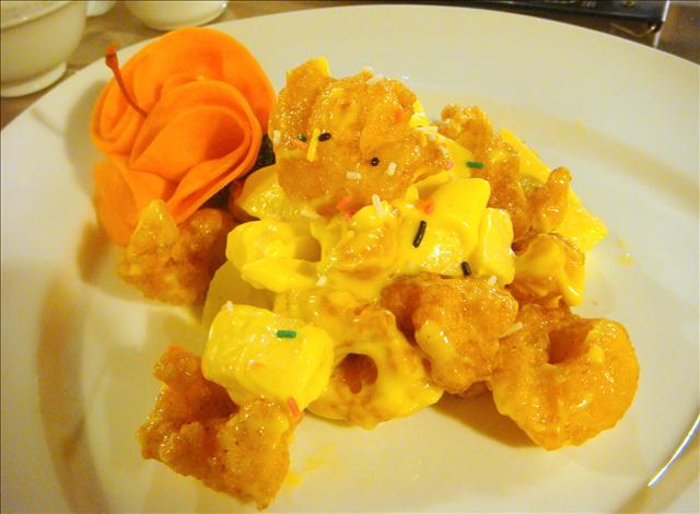 也是名列拿手好菜之林的"蘋果蝦球" (320), 用新鮮爽脆的蘋果塊來搭配炸到金黃色的蝦球, 更顯清爽